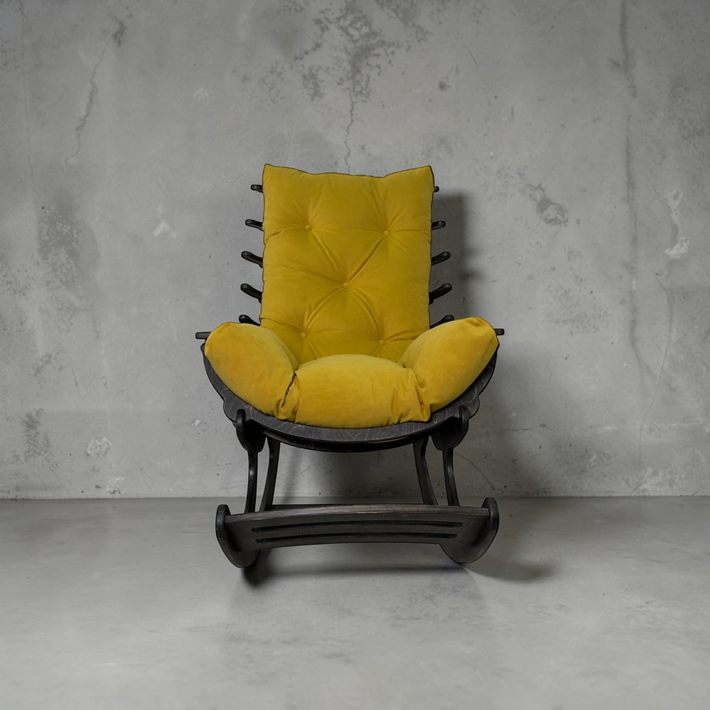 Кресло-качалка Fiamma - черный / Mimosa создано для спокойного отдыха без лишних движений. Конструкция продумана так, чтобы тело сразу занимало правильное положение - спина и поясница расслабляются, шея не напрягается, руки удобно лежат на длинных подлокотниках, а ноги располагаются естественно.