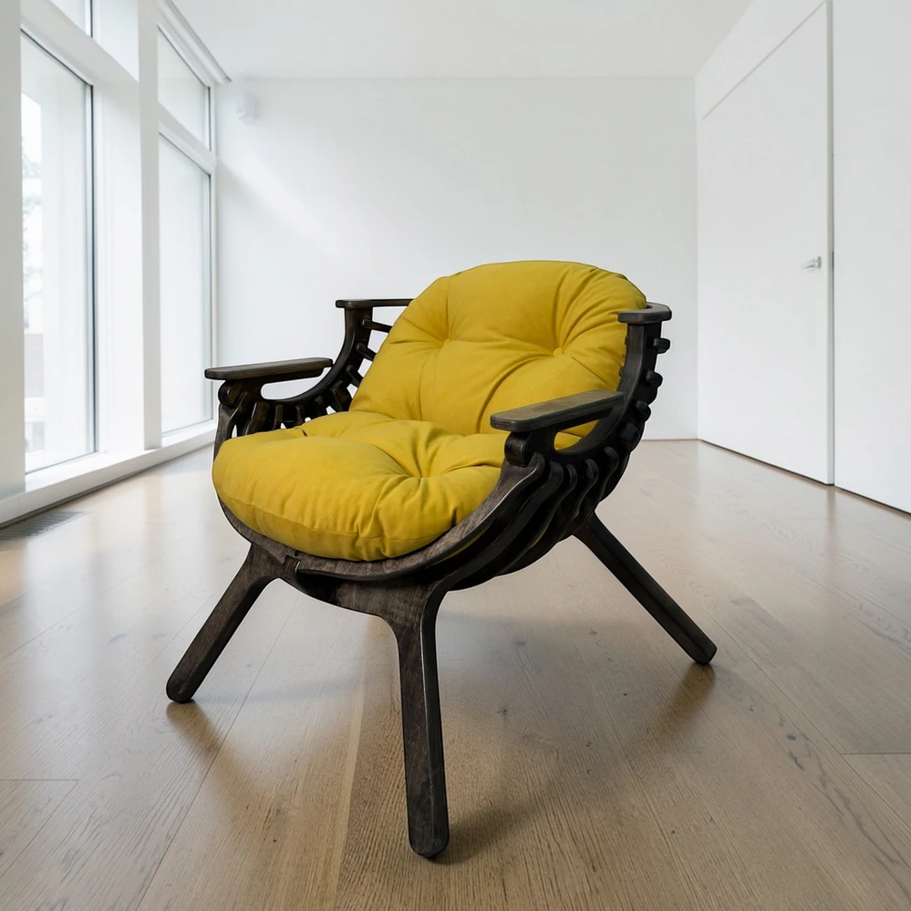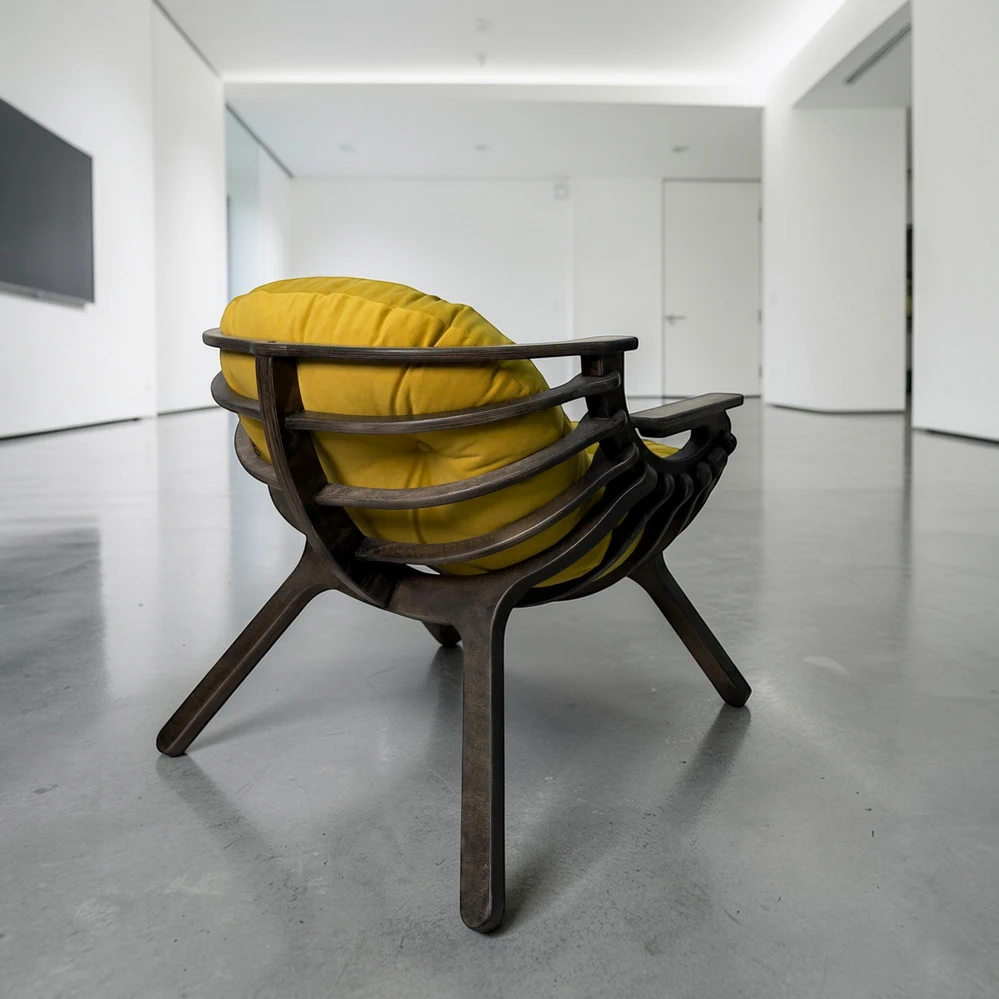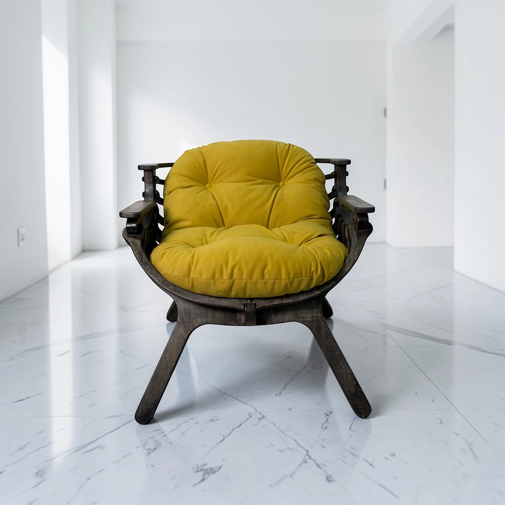 Форма кресла напоминает кокон, повторяя естественные контуры тела. Подлокотники продолжают линию рук, создавая удобную опору и снимая нагрузку с плеч и спины.