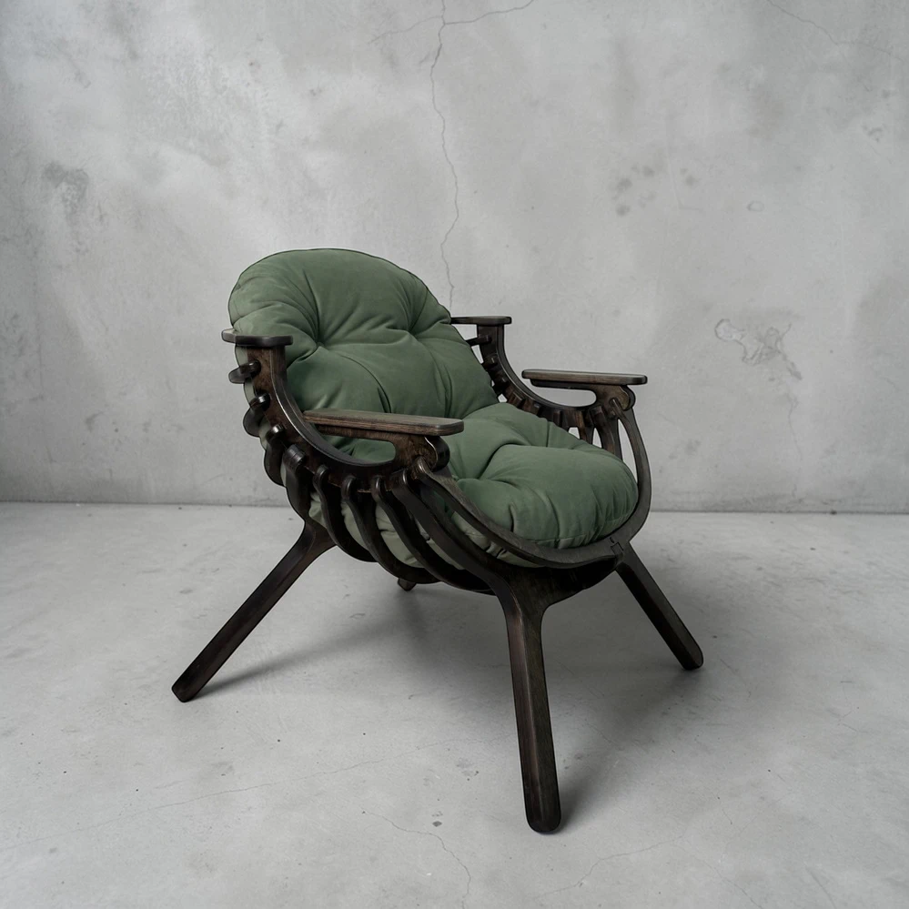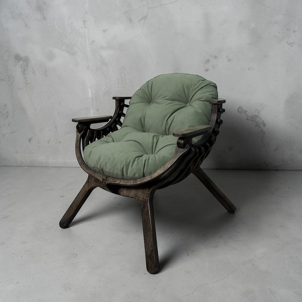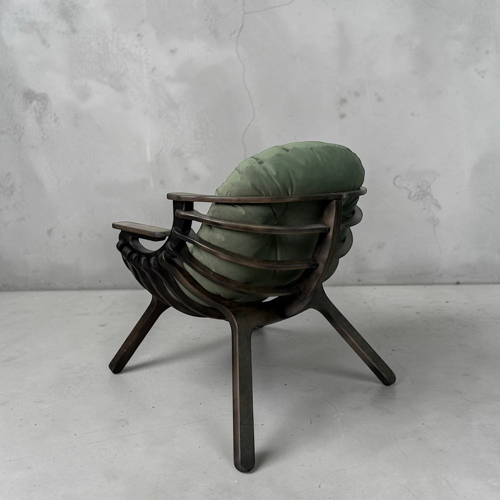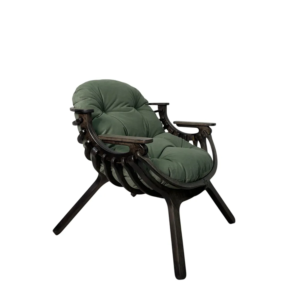 Форма кресла напоминает кокон и повторяет естественные линии тела. Подлокотники плавно продолжают положение рук, снимая нагрузку с плеч и спины.