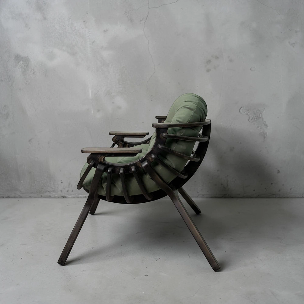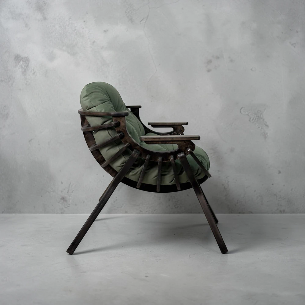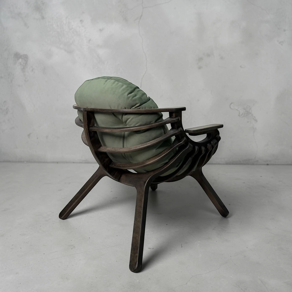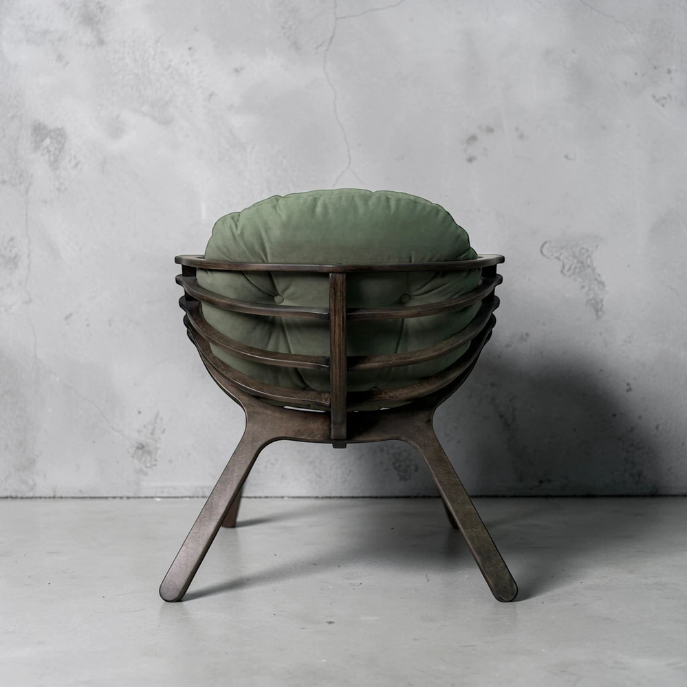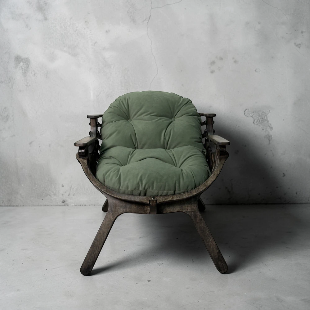 Форма кресла напоминает кокон и повторяет естественные линии тела. Подлокотники плавно продолжают положение рук, снимая нагрузку с плеч и спины.