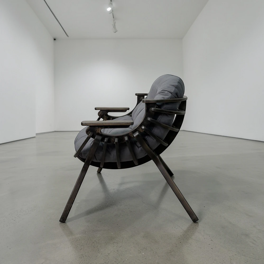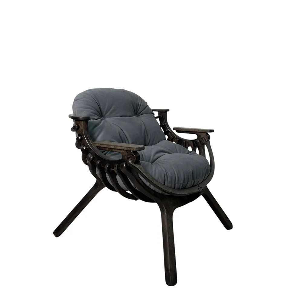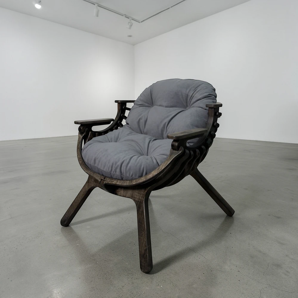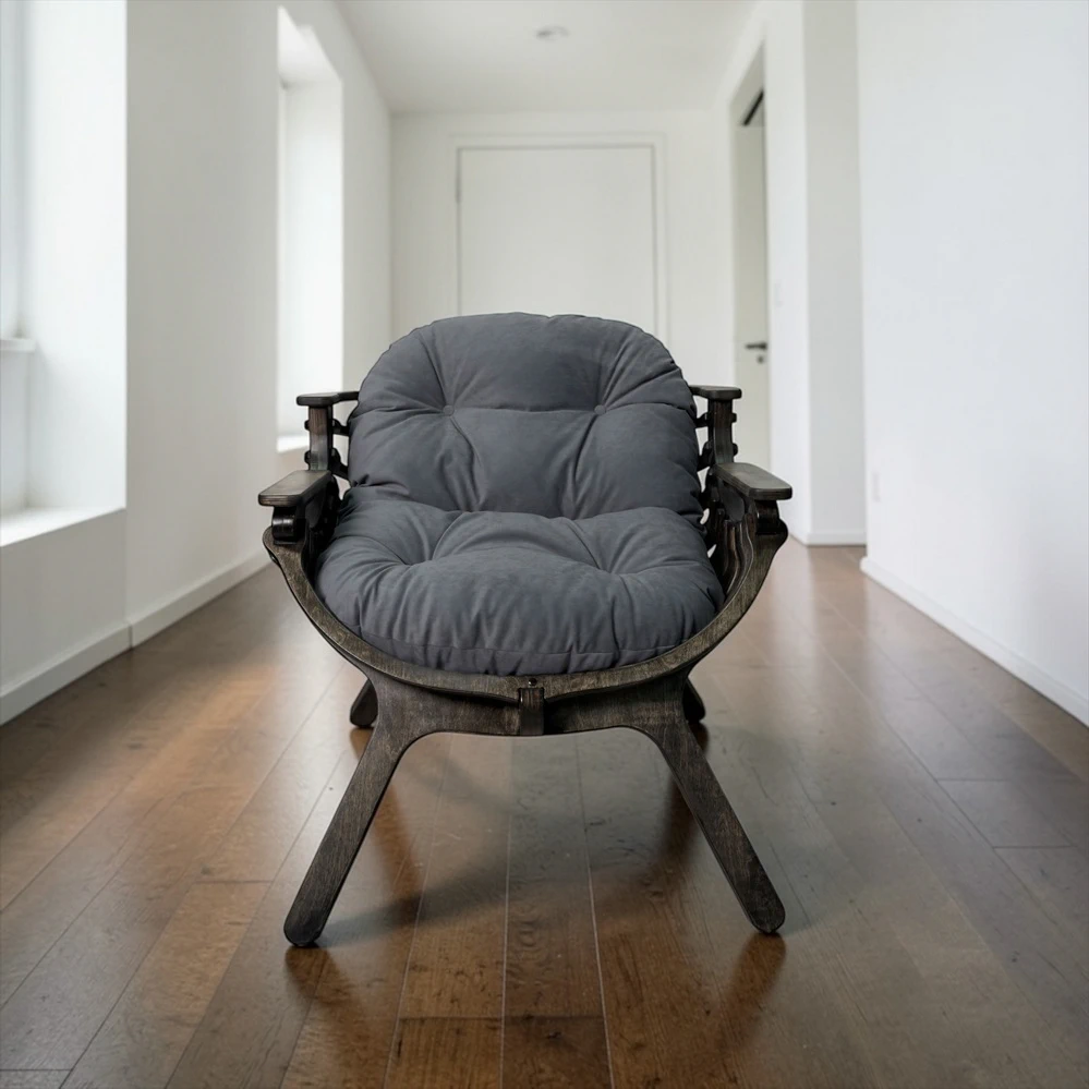 Каркас выполнен из березовой фанеры 18 мм с двойной конструкцией, что делает кресло прочным и долговечным. Ручная обработка деталей повышает надежность и срок службы.