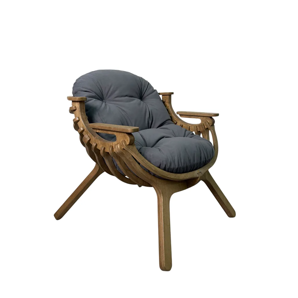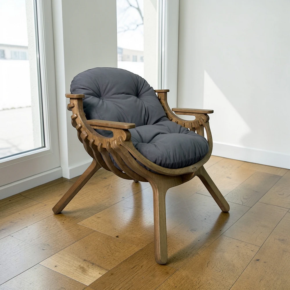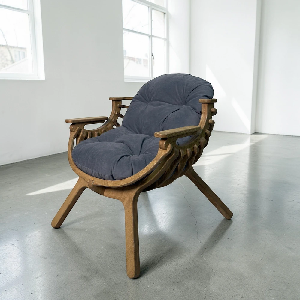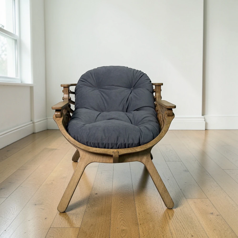 Каркас выполнен из березовой фанеры толщиной 18 мм с усиленной конструкцией. Ручная обработка, шлифовка и защитное покрытие делают кресло устойчивым к износу и продлевают срок его службы.