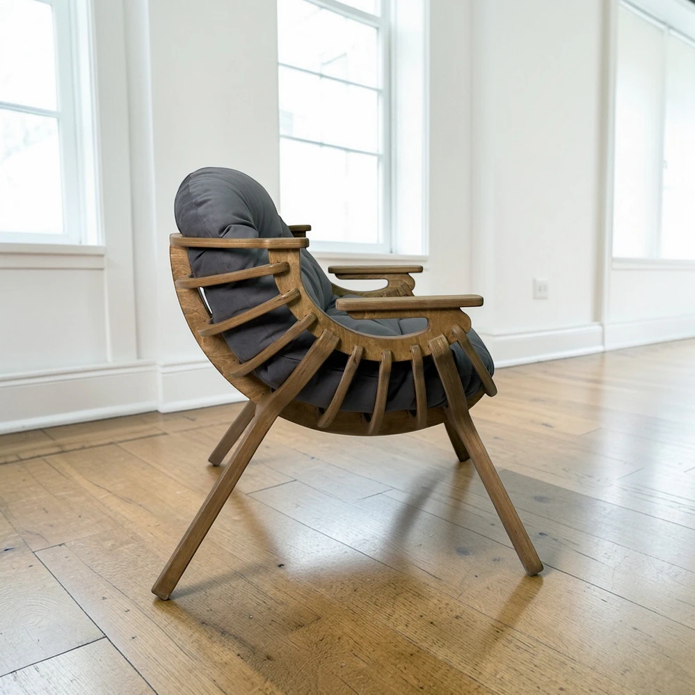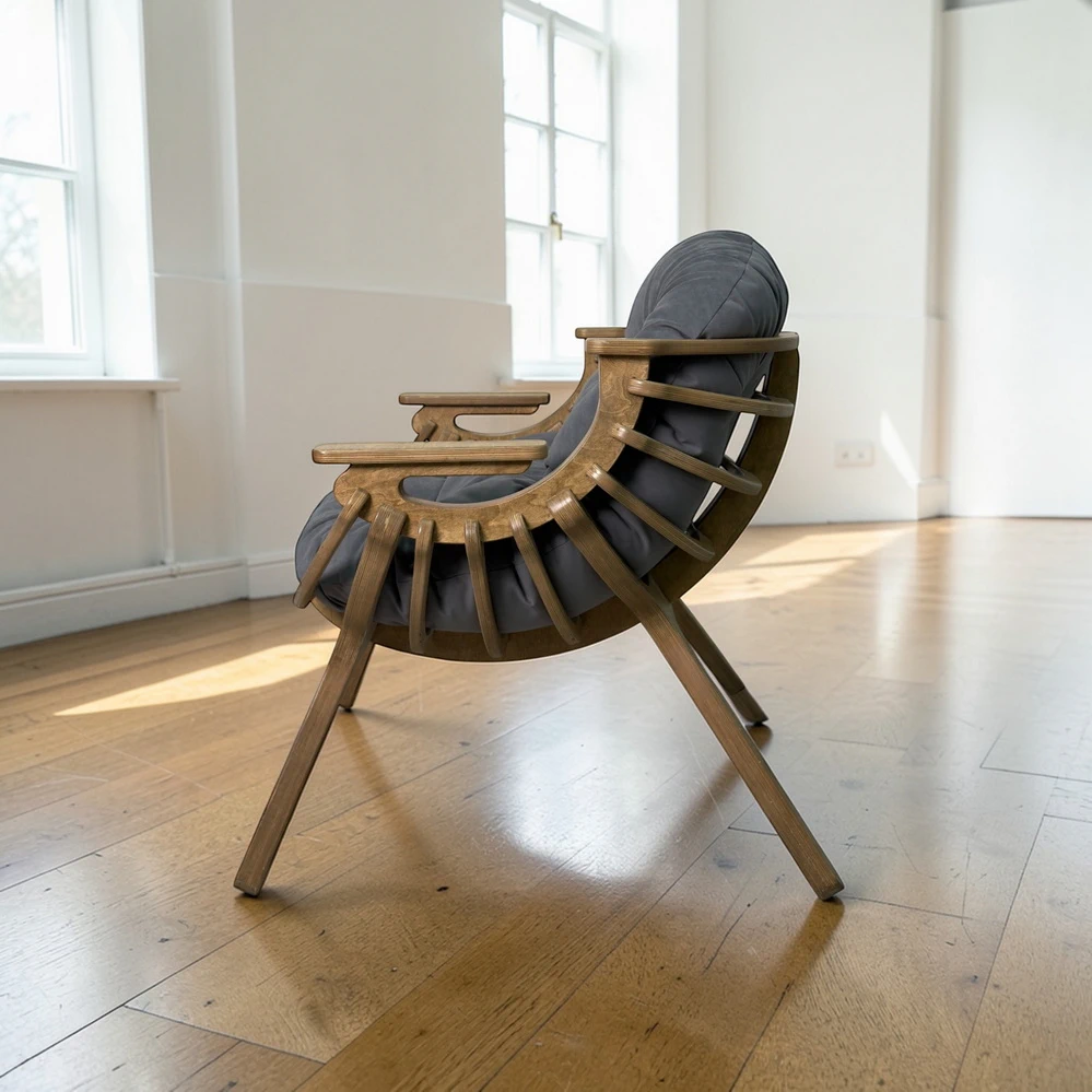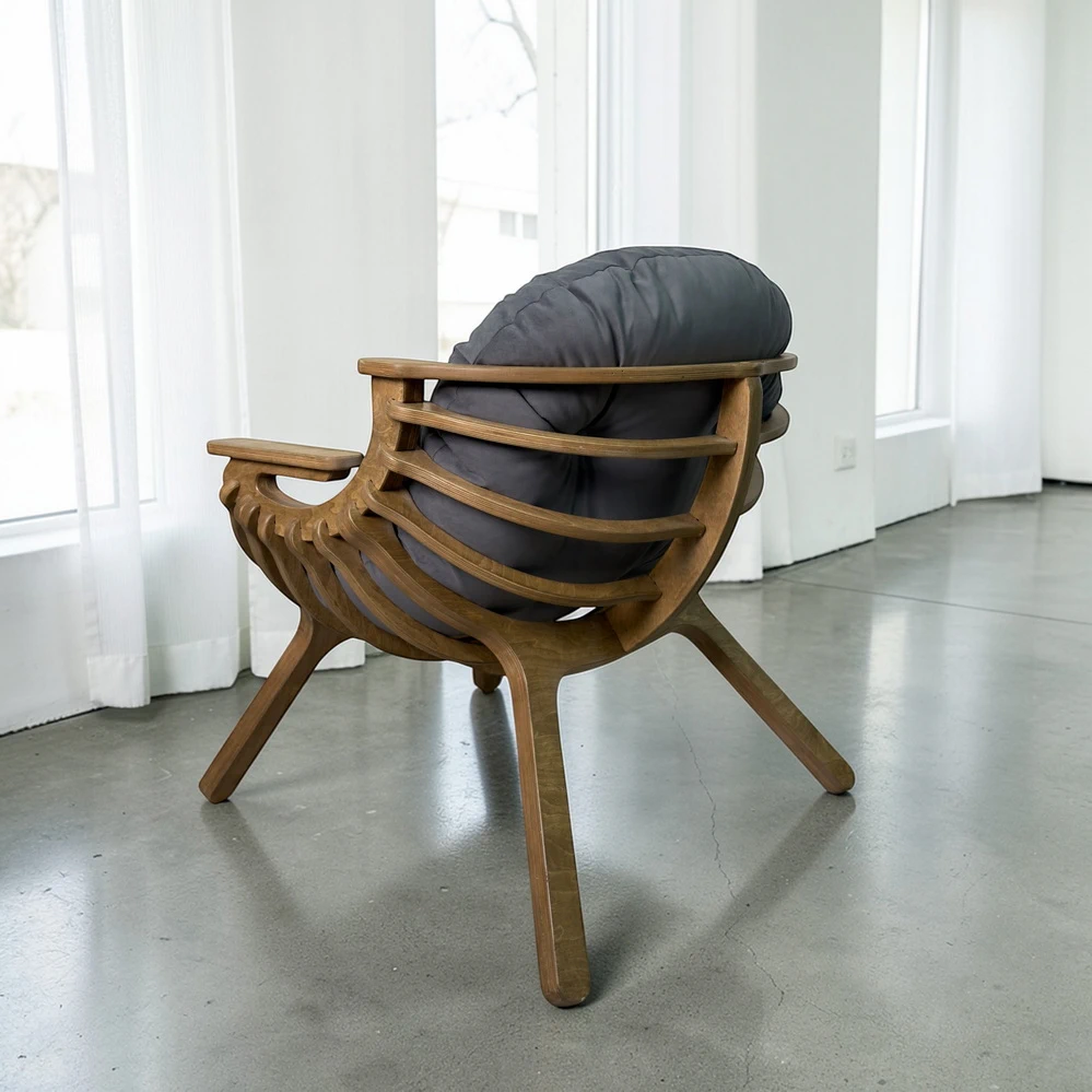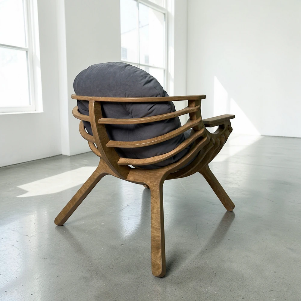 Каркас выполнен из березовой фанеры толщиной 18 мм с усиленной конструкцией. Ручная обработка, шлифовка и защитное покрытие делают кресло устойчивым к износу и продлевают срок его службы.