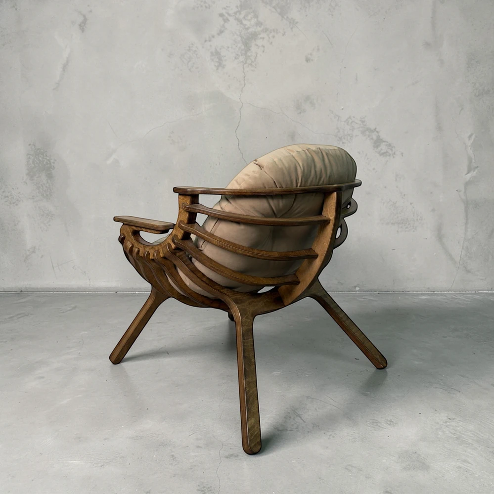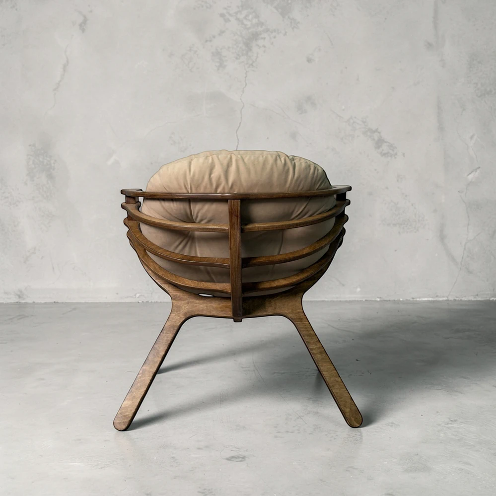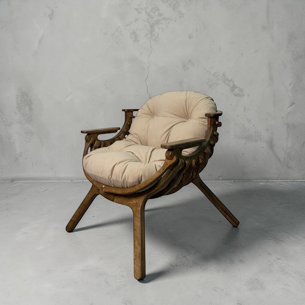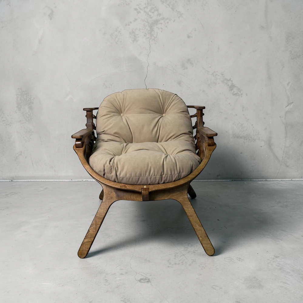 Каркас из березовой фанеры 18 мм с двойной конструкцией гарантирует прочность и надежность. Ручная обработка деталей повышает долговечность кресла.