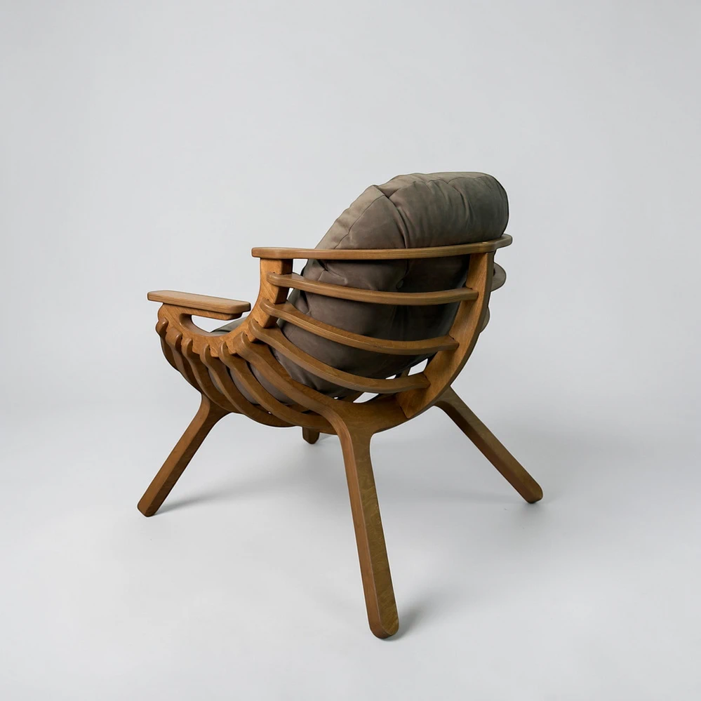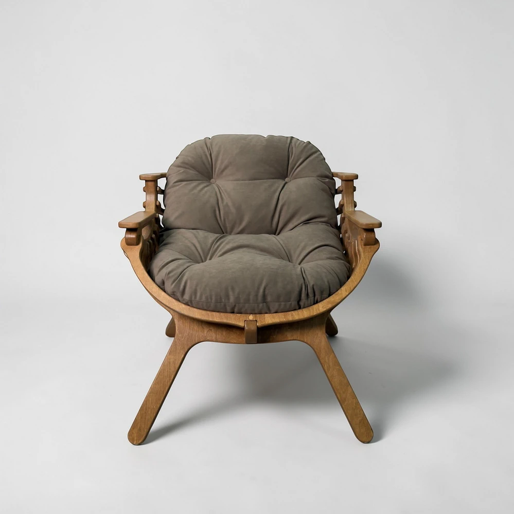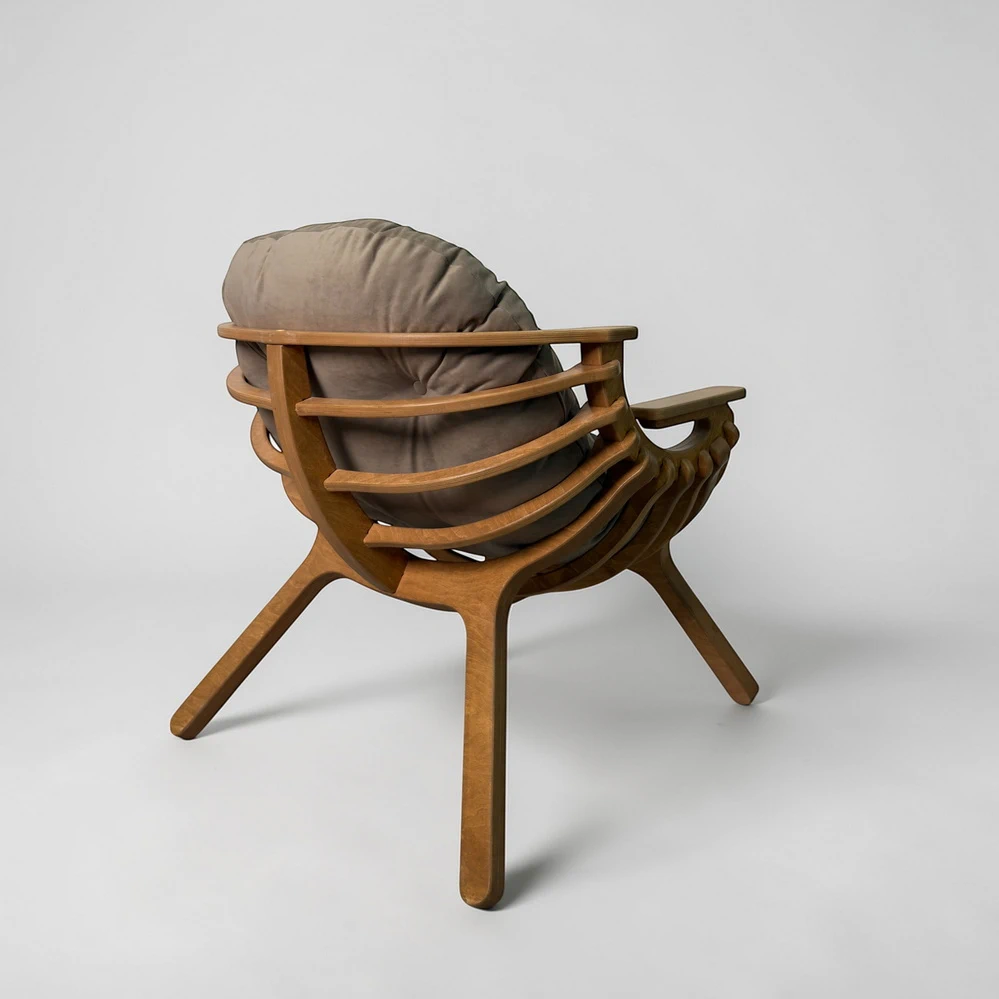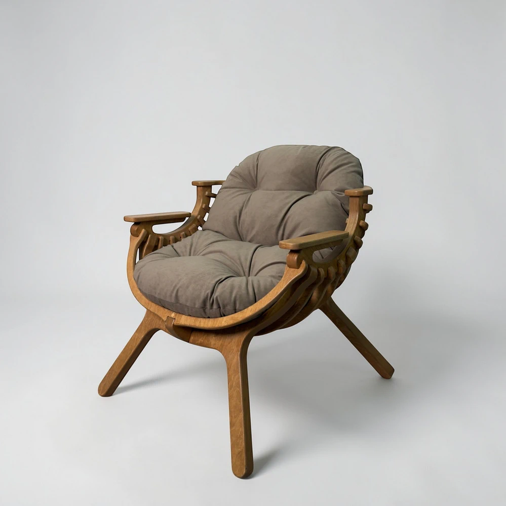 Каркас выполнен из двойного слоя березовой фанеры 18 мм, что обеспечивает высокую прочность и устойчивость. Форма кресла в виде кокона создаёт ощущение защищённости и располагает к расслаблению. Подлокотники повторяют естественное положение рук, позволяя сидеть без напряжения даже при длительном использовании.