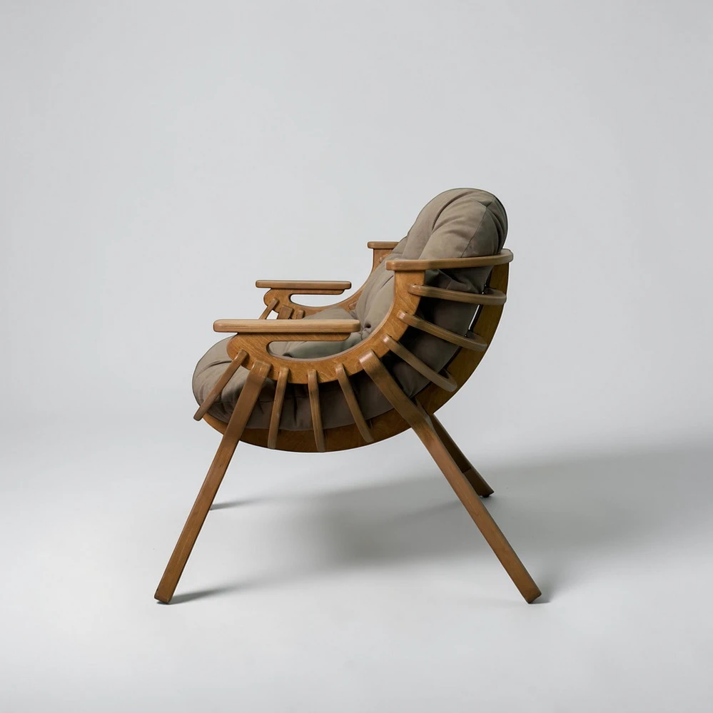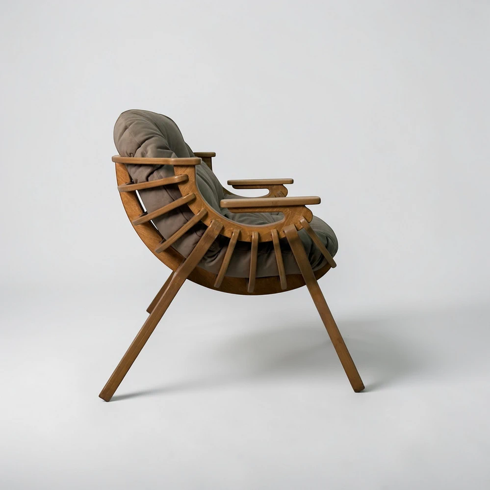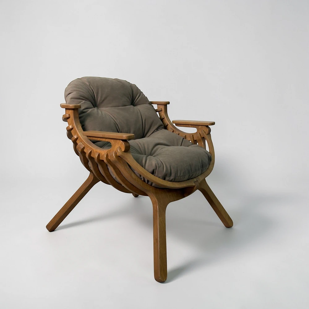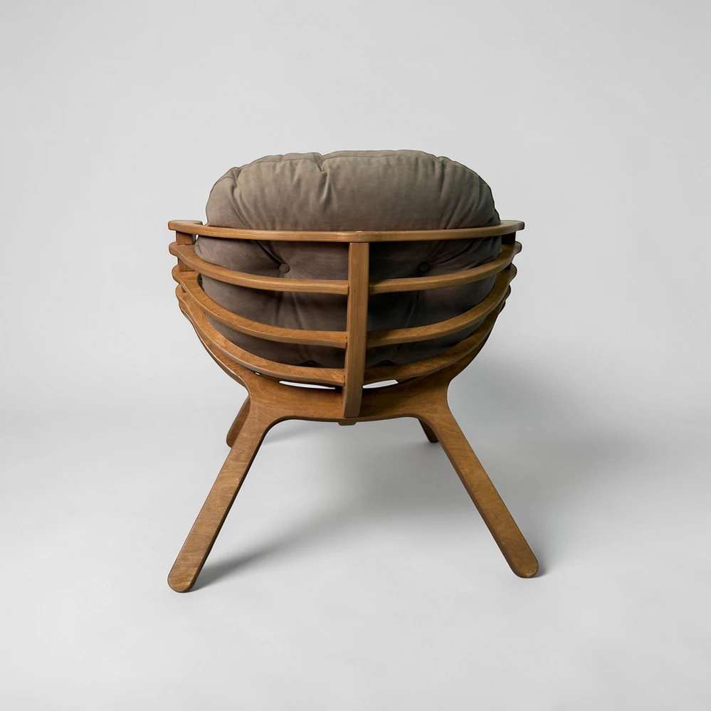 Каркас выполнен из двойного слоя березовой фанеры 18 мм, что обеспечивает высокую прочность и устойчивость. Форма кресла в виде кокона создаёт ощущение защищённости и располагает к расслаблению. Подлокотники повторяют естественное положение рук, позволяя сидеть без напряжения даже при длительном использовании.